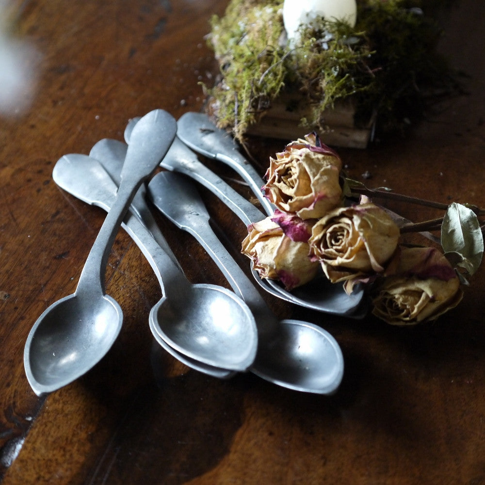 Set of six early 19thC French pewter spoons, for the francophile or quintessential props for your next photo shoot. Size: 21cm x D 4 cm
